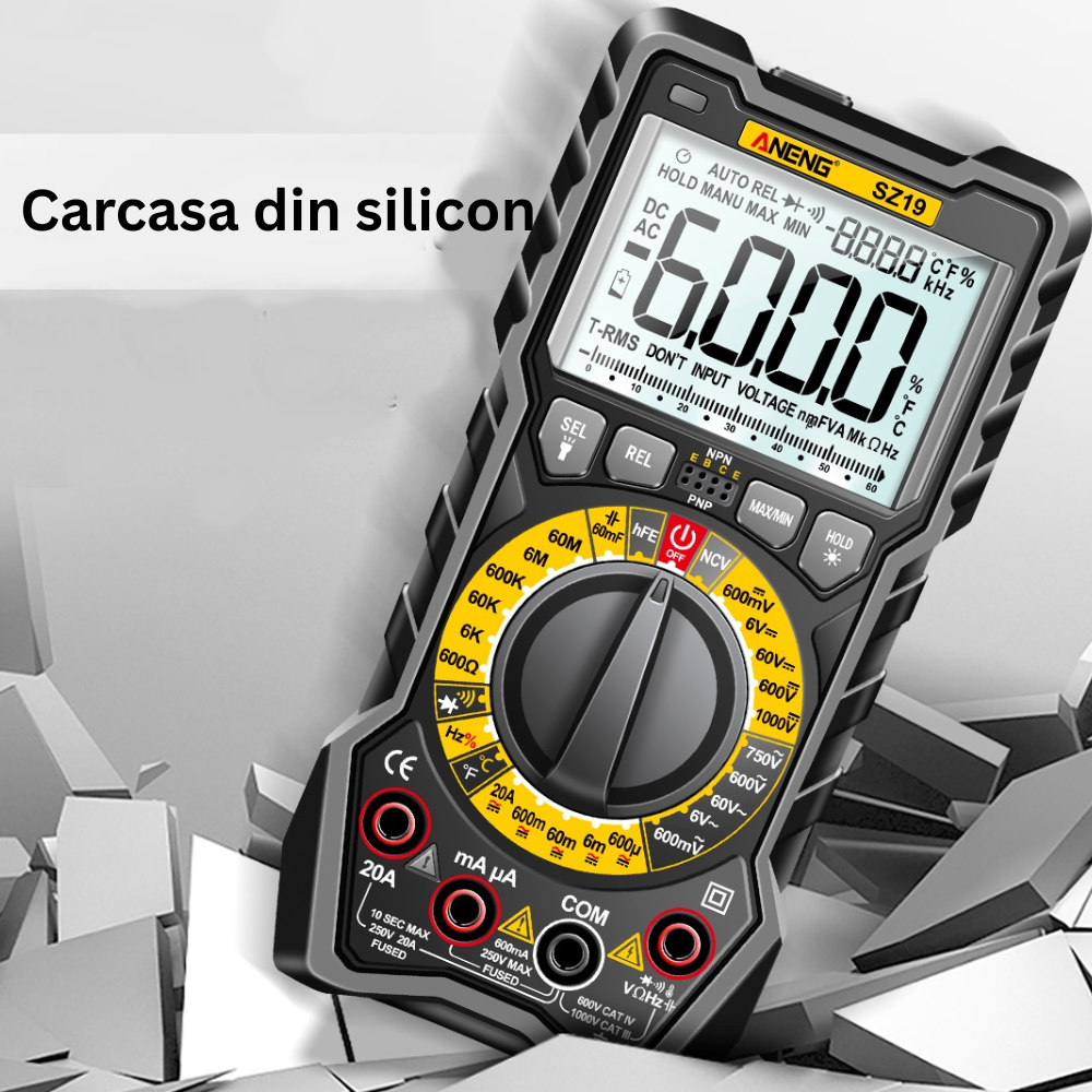 ANENG SZ19 este un multimetru digital profesional cu afisaj LCD iluminat, functie True RMS si selectie manuala a domeniului de masurare, conceput pentru aplicatii electrice, electronice si fotovoltaice. Ofera o combinatie echilibrata intre precizie, functionalitate si rezistenta, fiind potrivit atat pentru uz profesional, cat si pentru lucrari DIY. Dispozitivul permite masuratori precise de tensiune AC/DC, curent AC/DC, rezistenta, capacitate, frecventa, temperatura si testarea tranzistorilor, avand rezolutie de pana la 6000 counts pentru citiri detaliate. Detectarea tensiunii fara contact (NCV) si banda LED laterala pentru indicarea campului electric cresc siguranta in utilizare. Protectiile la supratensiune si supracurent, impreuna cu oprirea automata dupa 15 minute, contribuie la fiabilitatea in exploatare. Pentru aplicatii fotovoltaice, ANENG SZ19 suporta masuratori de pana la 1000V DC si 20A DC, permitand verificarea panourilor individuale, a stringurilor si a conexiunilor catre invertor. Este o unealta practica pentru instalatori de sisteme solare, electricieni si tehnicieni de mentenanta.